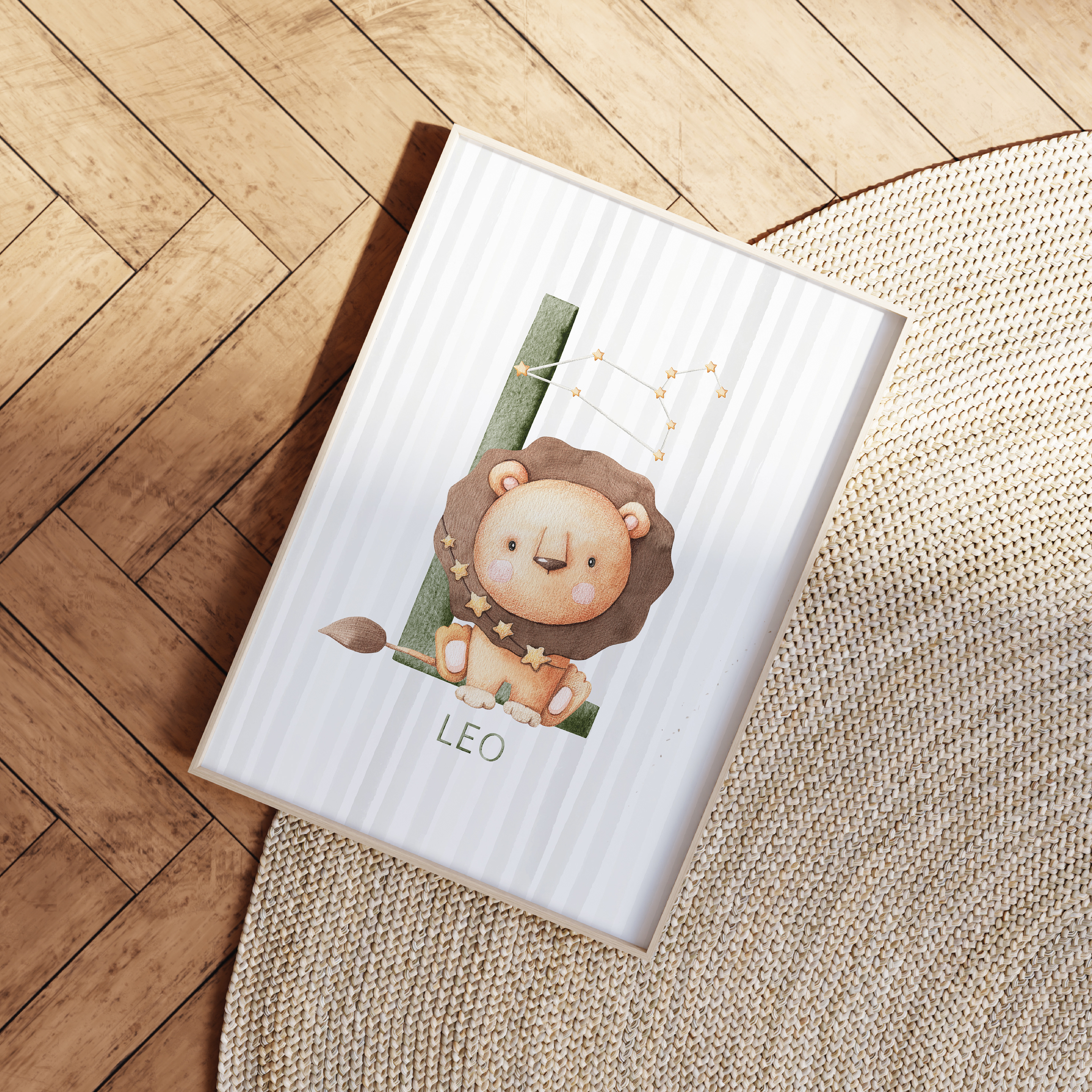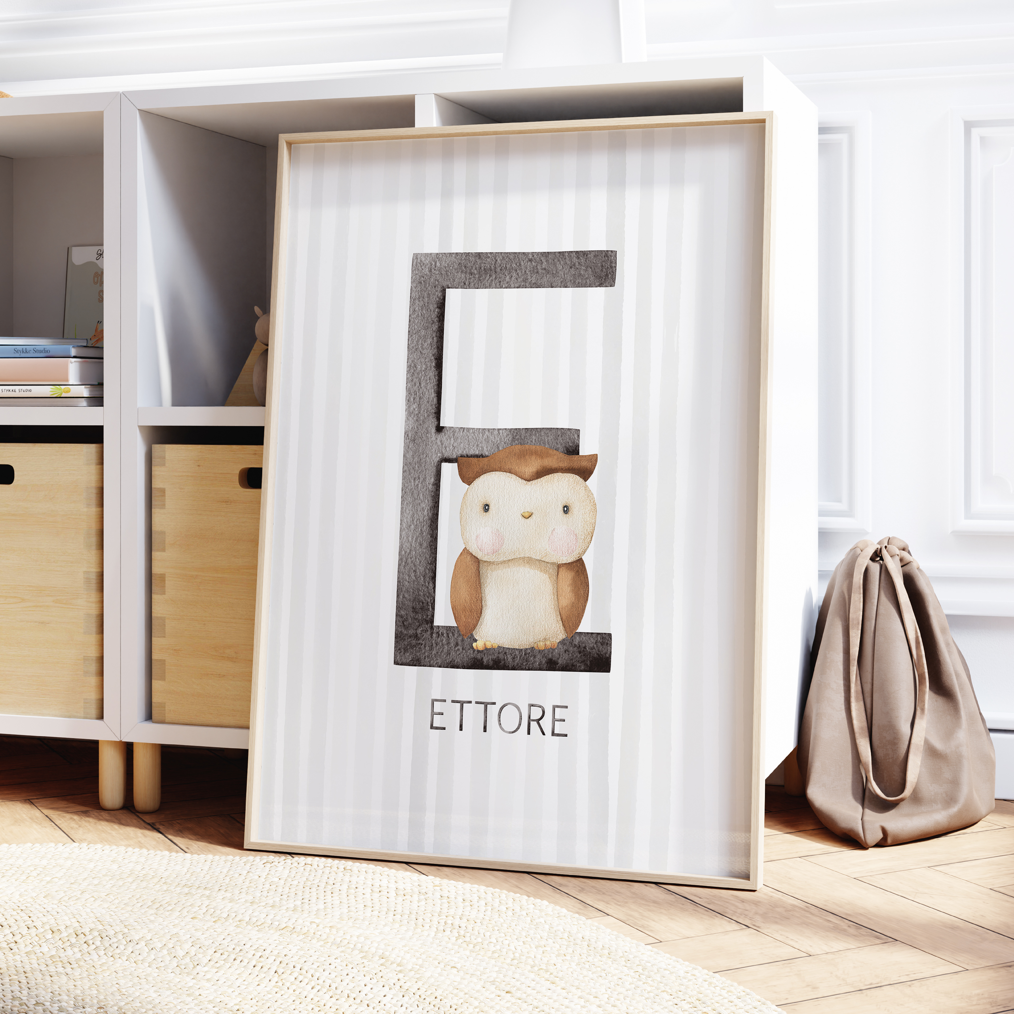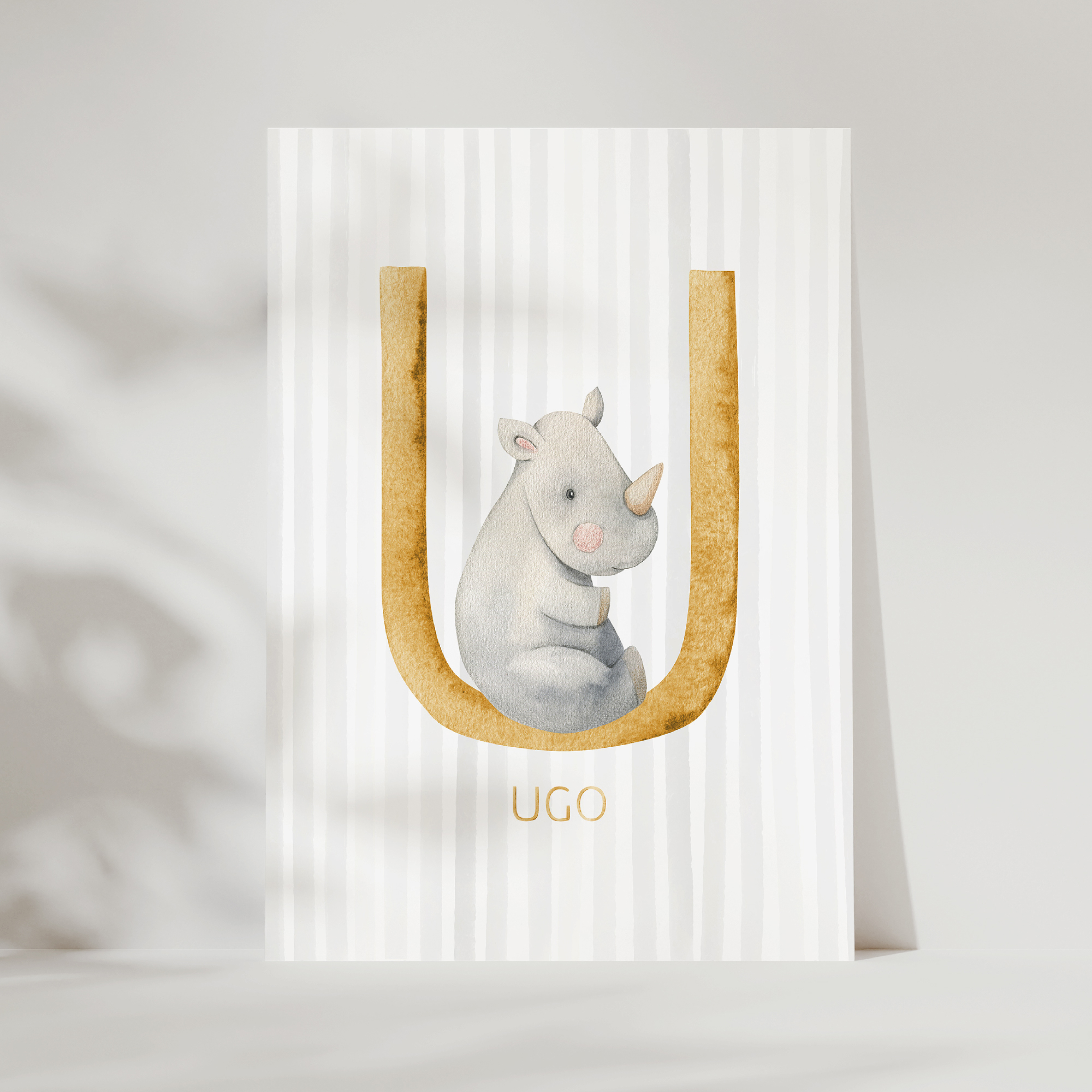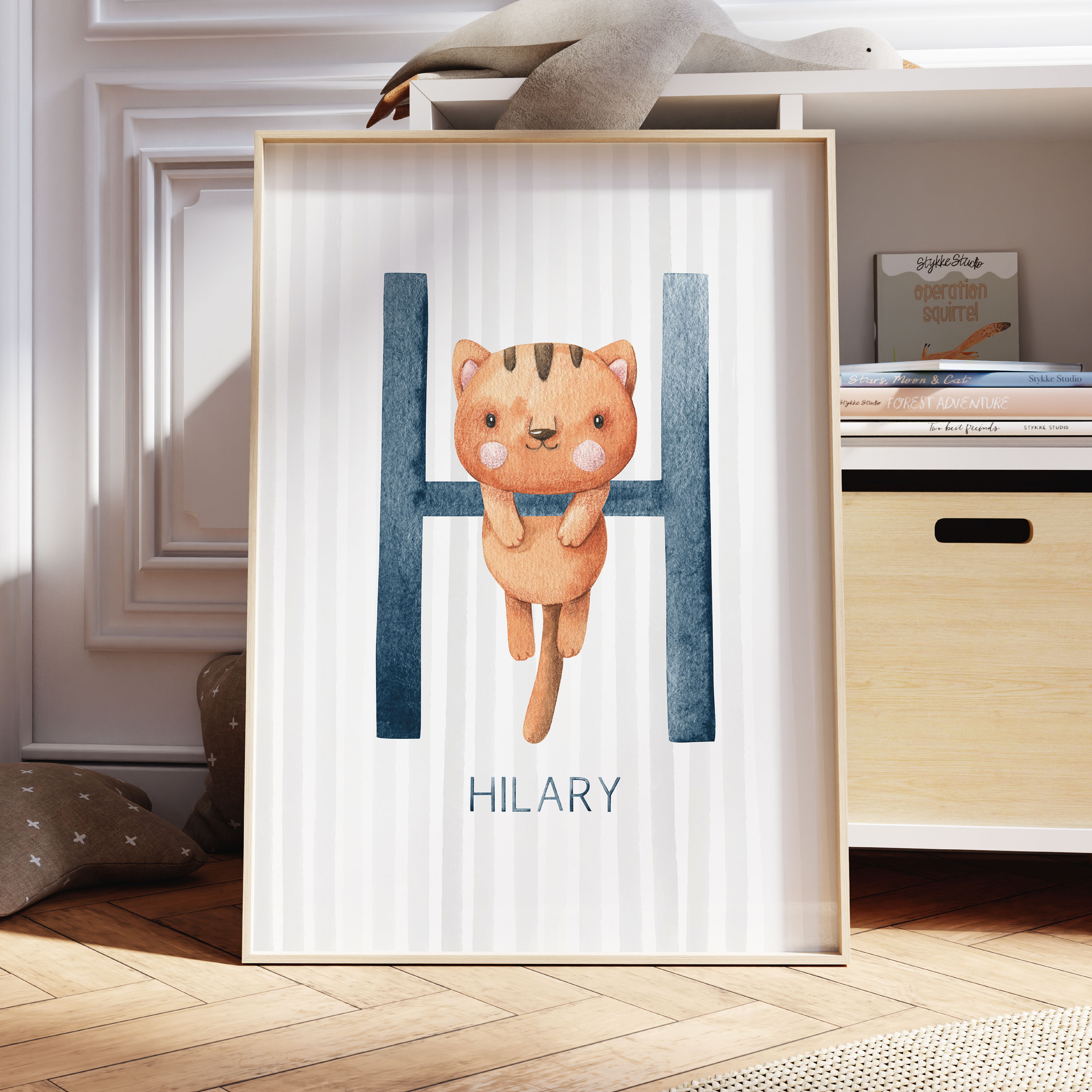 I created these illustrated initial posters for my brand, Carilune, with a design especially suited for a child’s bedroom or nursery. Each poster features the child’s initial, their name, a charming illustrated subject, and a subtle striped background.