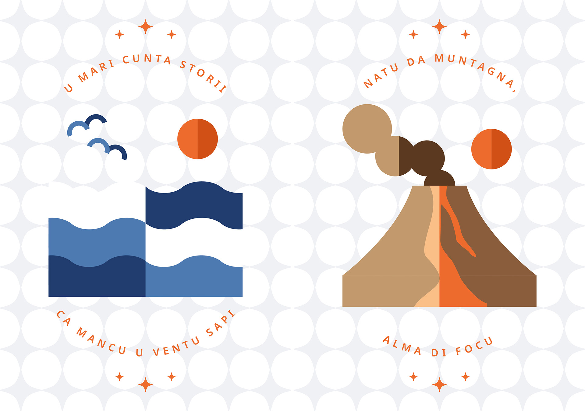 The illustrations combine clean, stylised forms with a vibrant colour palette inspired by the energy, light, and tradition of the island. Each design is completed with a short phrase in Sicilian dialect, adding a cultural and emotional touch that strengthens the connection to the territory.