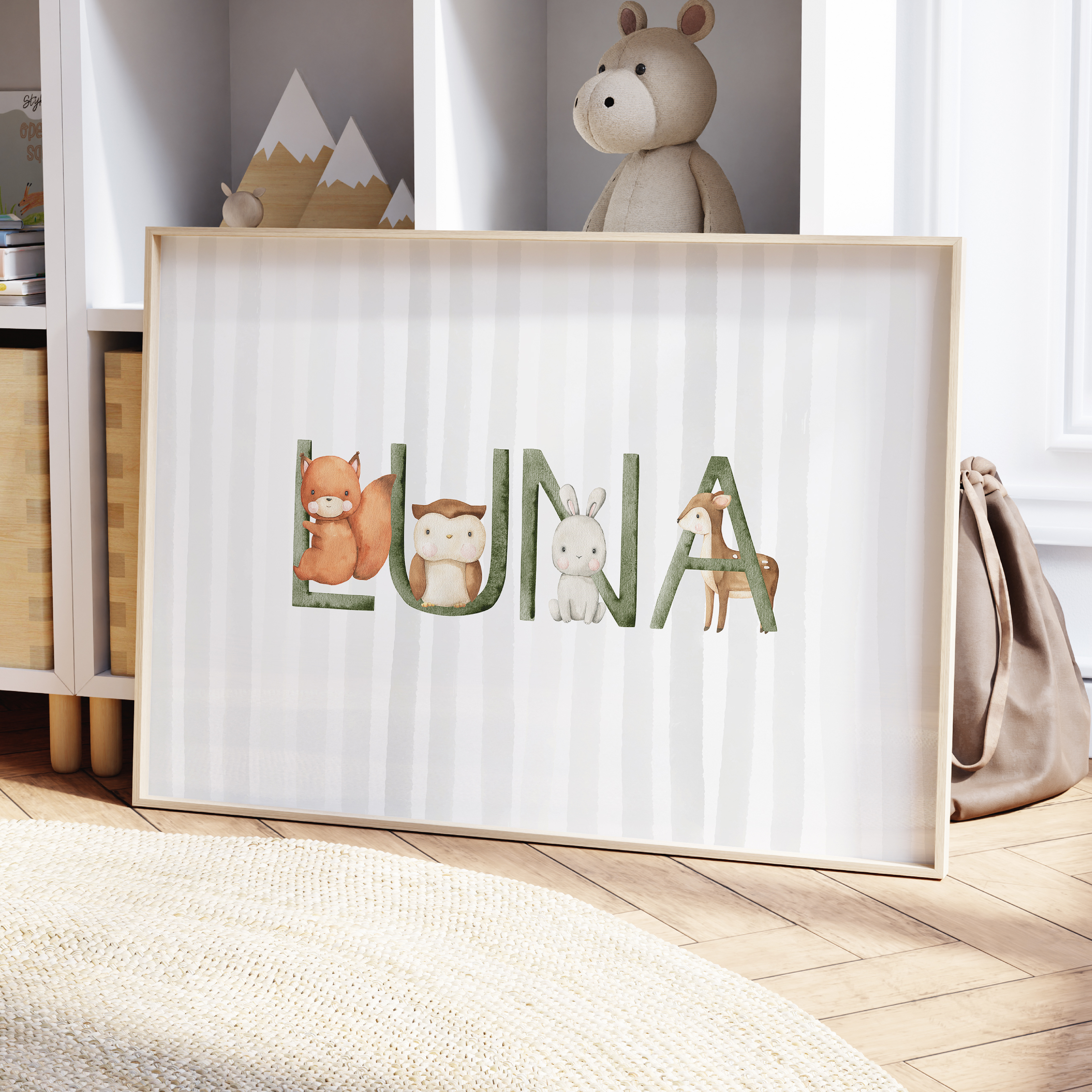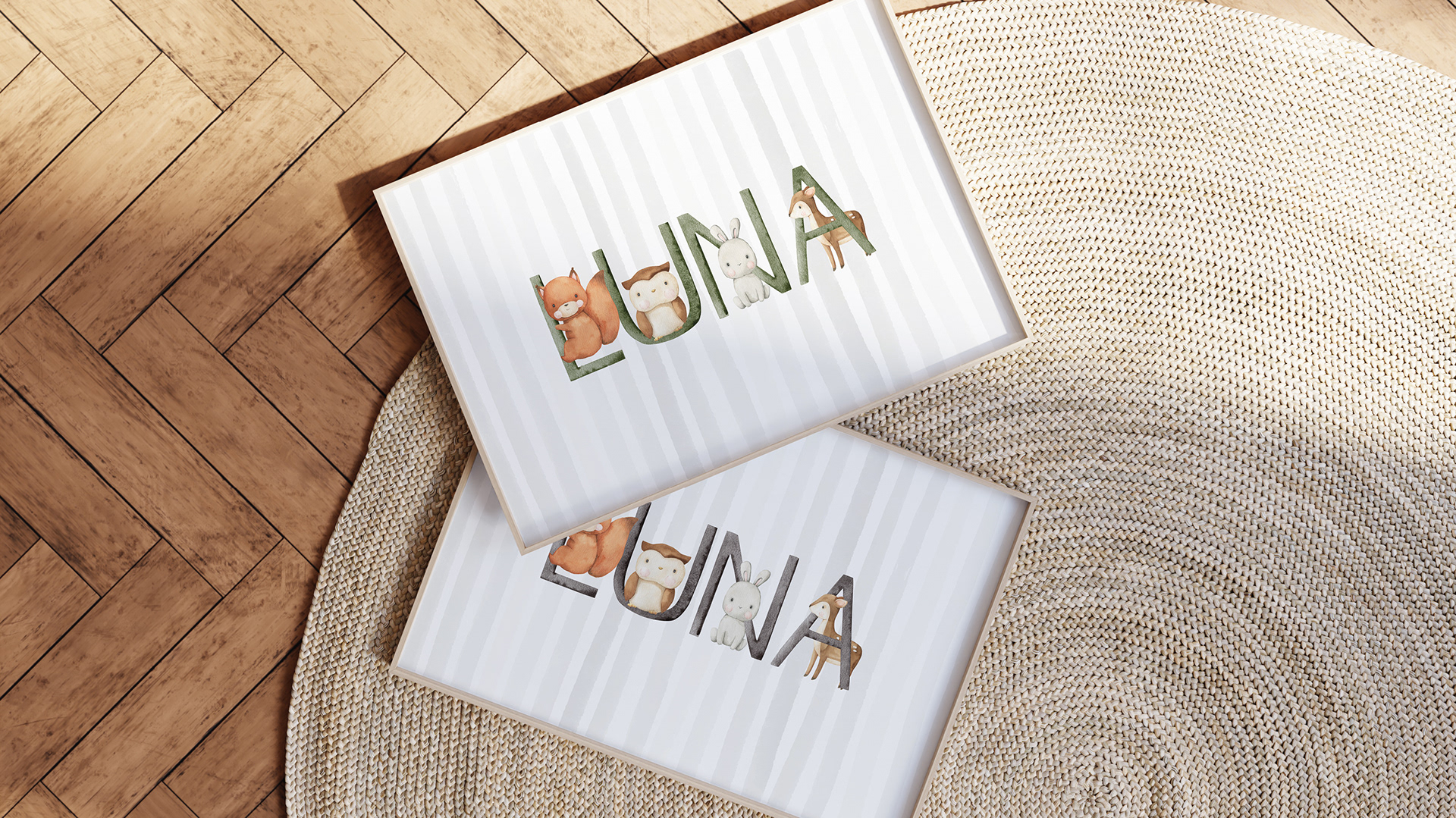 These posters feature a soft, striped background and the child’s name, provided by the customer at the time of purchase, with the option to choose the colour of the lettering. Each design also includes illustrated subjects — from safari animals to astronauts and outer space — making them perfect for children’s rooms or as thoughtful gifts for new parents and little ones alike.